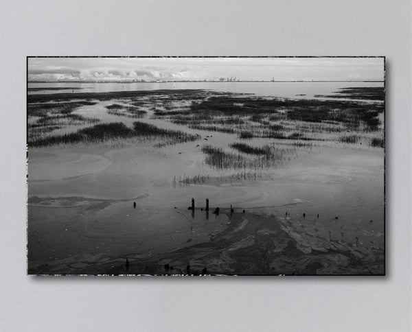 People are absent from the images, yet there are traces of human presence: the skeletal hulks of ships, electricity lines and fences, polluted waters, and industrial pipes billowing smoke on the horizon. Through these subtle details, Amis alludes to the ongoing destruction of these rural areas, many of which have been earmarked for new housing developments.